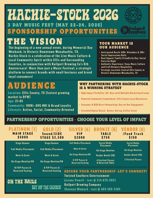 Sponsorship opportunities are now available - contact Shannan Womack of Railport Brewing Company - text 469-360-5385 or Jeremy Powell of Twisted Southern Entertainment - text 214-876-3803.