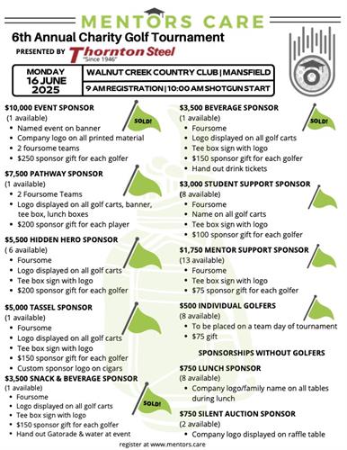 Mentors Care is having our 6th annual Golf Tournament on Monday, June 16th, at Walnut Creek Country Club! We are currently looking for teams and sponsors to help make this event a success. Your participation will directly impact the students we serve through Mentors Care. We would love to see you there!