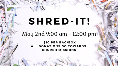 First United Methodist Church is hosting its annual Shred-it Event. The event is on May 2nd from 9:00 am to 12:00 pm. The paper shredding truck will be on site to shred items immediately. $10 per bag/box. All fund raised go to support church missions in the community.